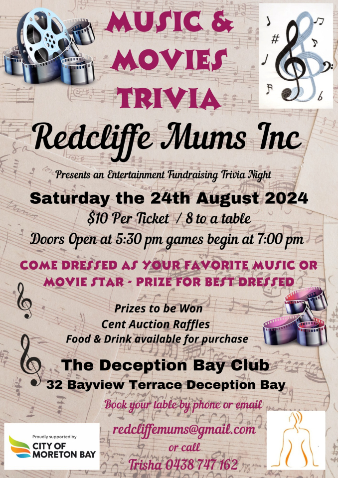 Trivia Night – Redcliffe Mums August 2024 by DBayAdmin · Published 23 July , 2024 · Updated 24 August , 2024 Calendar When: 24 August , 2024 @ 5:30 pm 2024-08-24T17:30:00+10:00 2024-08-24T17:45:00+10:00 Redcliffe Mums Share this: Click to share on Facebook (Opens in new window) Facebook Click to share on X (Opens in new window) X