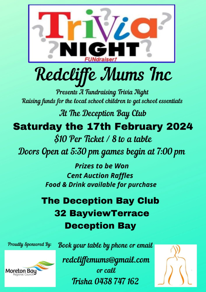 Trivia Night – Redcliffe Mums February 2024 by DBayAdmin · Published 3 February , 2024 · Updated 3 February , 2024 Calendar When: 17 February , 2024 @ 5:30 pm 2024-02-17T17:30:00+10:00 2024-02-17T17:45:00+10:00 Charity Redcliffe Mums Share this: Click to share on Facebook (Opens in new window) Facebook Click to share on X (Opens in new window) X