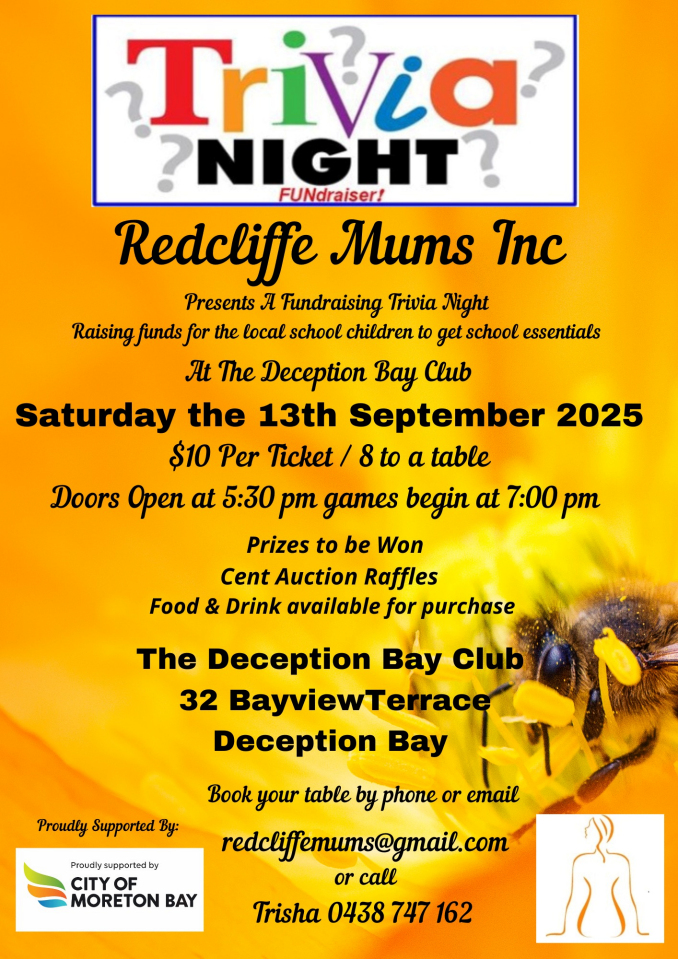 Trivia Night – Redcliffe Mums September 2025 by DBayAdmin · Published 26 July , 2025 · Updated 1 August , 2025 Calendar When: 13 September , 2025 @ 5:30 pm 2025-09-13T17:30:00+10:00 2025-09-13T17:45:00+10:00 Cost: $10 Contact: Trish 0438 747 162 Email Charity Redcliffe Mums Share this: Click to share on Facebook (Opens in new window) Facebook Click to share on X (Opens in new window) X