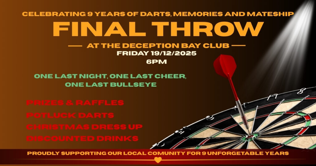 As we look back on nearly a decade of darts at Deception Bay, it’s impossible not to feel a mix of pride, gratitude, and emotion. What started as a simple gathering of players soon grew into something so much bigger — a community, a family, and a place where everyone belonged.
